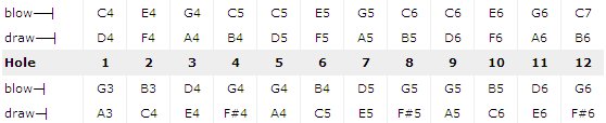 Минорный блюзовый лад также доступен, но нота на выдох в 6 (9) отверстии должна быть понижена бендом через бенд на выдохе.