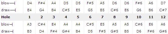 Пояснение таблатуры: 2 = отверстие 2 на выдох, -1 = отверстие 1 на вдох, -3' = отверстие 3 вдох с бендом
