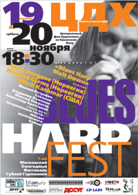 19-е ноября, пятница, 18:30 - шоу гармонистов Blues Harp Melt Down - Mitch Kashmar (США), Eirik Bergene (Норвегия), Richard Gjems (Норвегия), открывает фестиваль Михаил "Петрович" Соколов.