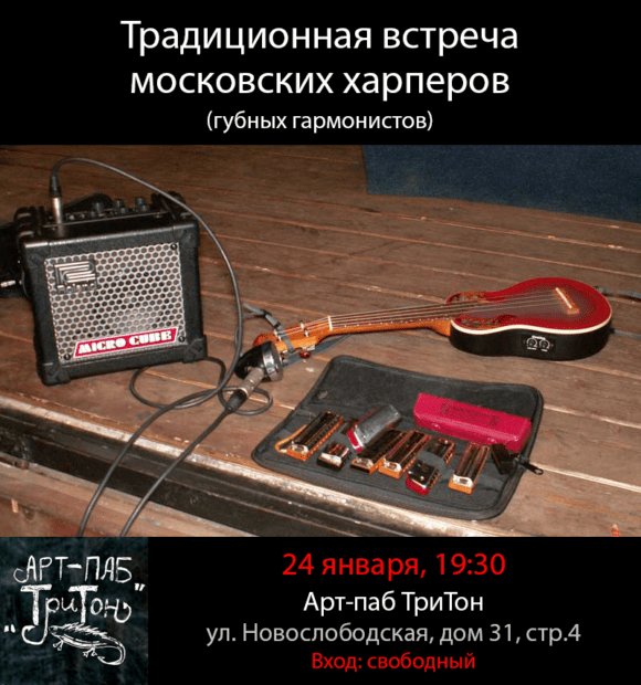 Приглашаем вас посетить очередной сбор губных гармонистов, который состоится 24 января в Арт-пабе «ТриТон» в 19:30. Группа в контакте (подписываемся) — здесь.