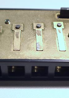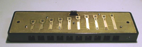 Итак, начнем. Я начинал с нот на выдохе. Ноты на выдохе находться на верхней пластине гармошники, а сами языки на нижней стороне верхней пластины, так что добраться до них в обычном состоянии гармошки невозможно. Что бы до них добраться, я поменял верхную и нижную пластины местами на время перестройки нот, которые обычно находяться на выдохе. Единственное неудобство, связанное с переменой мест пластин - это то, что ноты, которы мы будем настраивать, теперь извлекаются на вдохе, так что надо быть осторожным и извлекать при настройка чистые ноты и случайно их не забендить. Для каждого отверстия перед началом настройки советую еще раз потренироваться извлекать чистую ноту (без бенда).