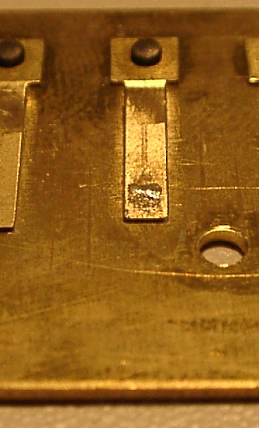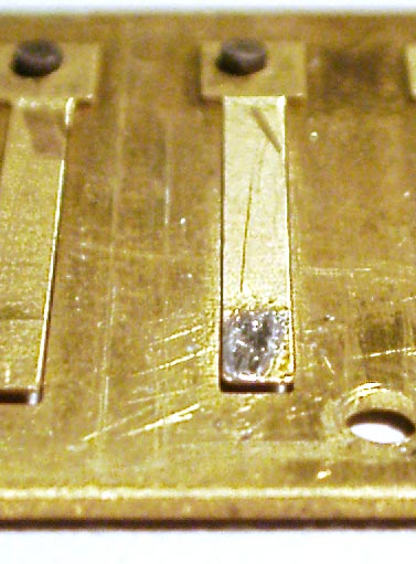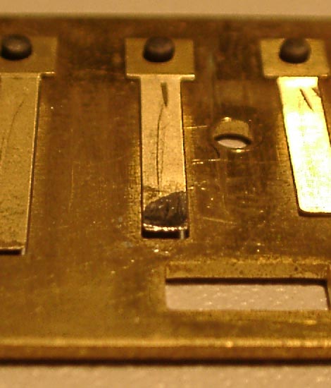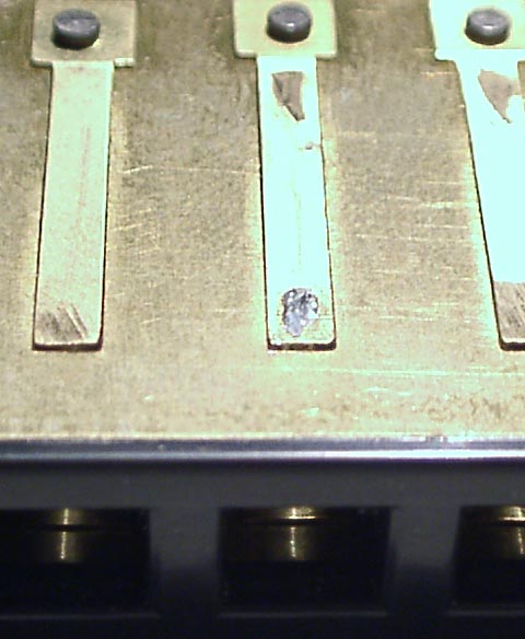 Займемся перестройкой, например, второго отверстия. Если мы извлекем ноту на вдохе (та, что обычно звучит на выдохе), она должна быть F#. Добиваемся чистого извлечения этой ноты на втором отверстии на вдохе. Теперь надо её понизить до F. Для этого нам надо капнуть совсем немного припоя на самый кончик пластины. Для того, что бы припой лег хорошо, надо сначала снять верхний слой окисла с голоса, для этого возьмем первый скальпель в одну руку, и второй в другую. Острием первого скальпеля мы будет поддерживать кончик языка, что бы не деформировать его, а вторым скальпелем немного поскребем кончик плстины для того, что бы снять окисел и припой легче и крепче лег на пластину. После этого разогретым паяльником надо припоять капельку припоя. Капелька болжна быть очень маленькая. Чем меньше, тем лучше. У меня получалось положить только такую капельку, которая сразу понижала ноту на 2-3 полутона. А нам нужно только на один! После этого, берем скальпель и отковыриваем капельки канифоли и все лишее, что нам не нужно. У меня, например, пару раз припой оставался сбоку от языка и поэтому при попытке извлечь звук на этом языке, нота извлекалась только с дребежжанием. После того, как мы получаем чистый язычек с капелькой припоя, извлекаем чистую ноту на выдохе в микрофон и смотрим, что мы имеем. У меня, как я уже говорил, получалось сразу понизить ноту на несколько полутонов. Что бы её теперь повысить до той частоты, что нам нужна пользумеся натфилем (для грубой и быстрой настройки) или скальпилями (для долгой и точной настройки). Советую не делать больше двух "скребков" без проверки звука, иначе можно переборщит и опять придется капать припой, что, естественно, не желательно. Помимо этого, мне кажеться, лучше соскребать так, что бы остатки капельки бали наибольшей площади и наименьшей толщины, т.к. так лучше коптакт между каплей и языкам. И, к тому, же, бывали случаи, когда при громкой игре звуги задевали о корпус. Но на SilverStar'е это совсем не существенно.