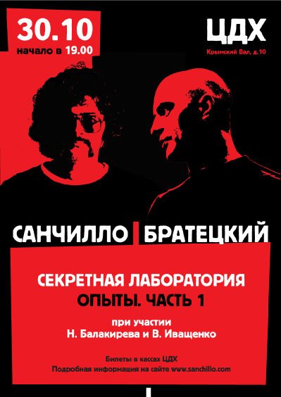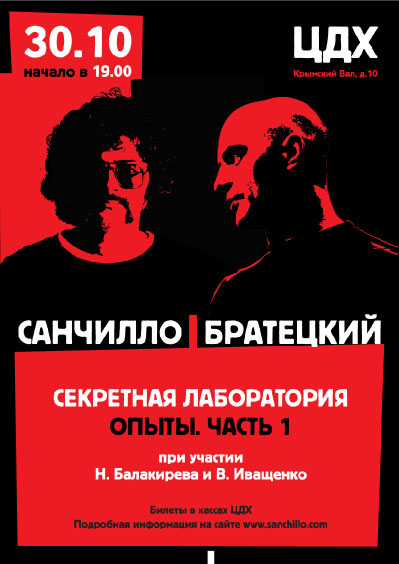 Евгений САНЧИЛЛО и Александр БРАТЕЦКИЙ СЕКРЕТНАЯ ЛАБОРАТОРИЯ в программе ОПЫТЫ. ЧАСТЬ 1 ЦДХ, Крымский Вал, д.10 30 октября. начало в 19.00 Билеты в кассах ЦДХ Подробности