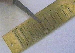 Когда вы извлекли ваши язычки, (лучше, если плохой язычок не сломан, тогда вы сможете сравнить размеры), возможно будет нужно подпилить стороны нового язычка ... в моем случае, я использовал старую пластину от Blues Harp, и низкие голоса в ней более широкие чем средние в моей Pro Harp. Пробуйте подобрать их размеру, и проверить её ширину, так чтобы она свободно двигалась вертикально в прорези пластины. Если новый язычок больше, вы должны укоротить его ... нужно поместить язычок в пластину со старой заклепкой, и отметьте конце язычка где кончается прорезь в пластине (долотом), потом отрежьте (осторожно) и подпиливайте до тех пор, пока не получите точный размер (или немного большие).