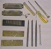 ПРЕДУПРЕЖДЕНИЕ: Прежде, чем вы пробуете менять язычок, убедитесь, что именно он поврежден. Если у вас не получается извлечь никакого звука, если пластина загрязнена, проверьте центрирование язычка. Вы должны убедиться подвижности язычка, он должен свободно вибрировать, и проверить его расположение (или зазор от вершины язычка к пластине). Если Вы получаете более низкий тон чем нужно, пробуете его повторно настроить ..., если тон станет низить снова, когда вы играете (или слишком трудно будет подстроить тон), тогда нужно заменять язычок. Если звук отличается больше чем полтона, не тратьте впустую время на перенастройку. Нужно заменить язычок, даже если вы можете его подстраивать, он все равно быстро сломается. Что вам нужно, или что использовал я: - Старая пластина с голосами, откуда можно взять хорошие язычки. - Набор инструментов Lee Oskar (отвертка, плоскогубцы, инструмент для измерения зазора между пластиной и язычком, инструмент для поддержки язычка, напильник, острое и широкое долото), или нечто подобное. - Дрель, и тонкое сверло (по размеру отверстия для заклепки). (Необязательно, я больше её не использую). - Молоток, и маленькие гвозди - Маленькие винты, которые нужно использовать как заклепки (Вы можете найти их в часовой мастерской). (Необязательно, я больше их не использую) - Металлическая полоска с отверстием размером с головку заклепки.Здесь вы можете увидеть мою разобранную MS Special 20, и некоторые из инструментов, которые я использовал. Также видно накладки, гребенку и звуковые пластины. Здесь же можно увидеть мои старые пластины от Blues Harp.