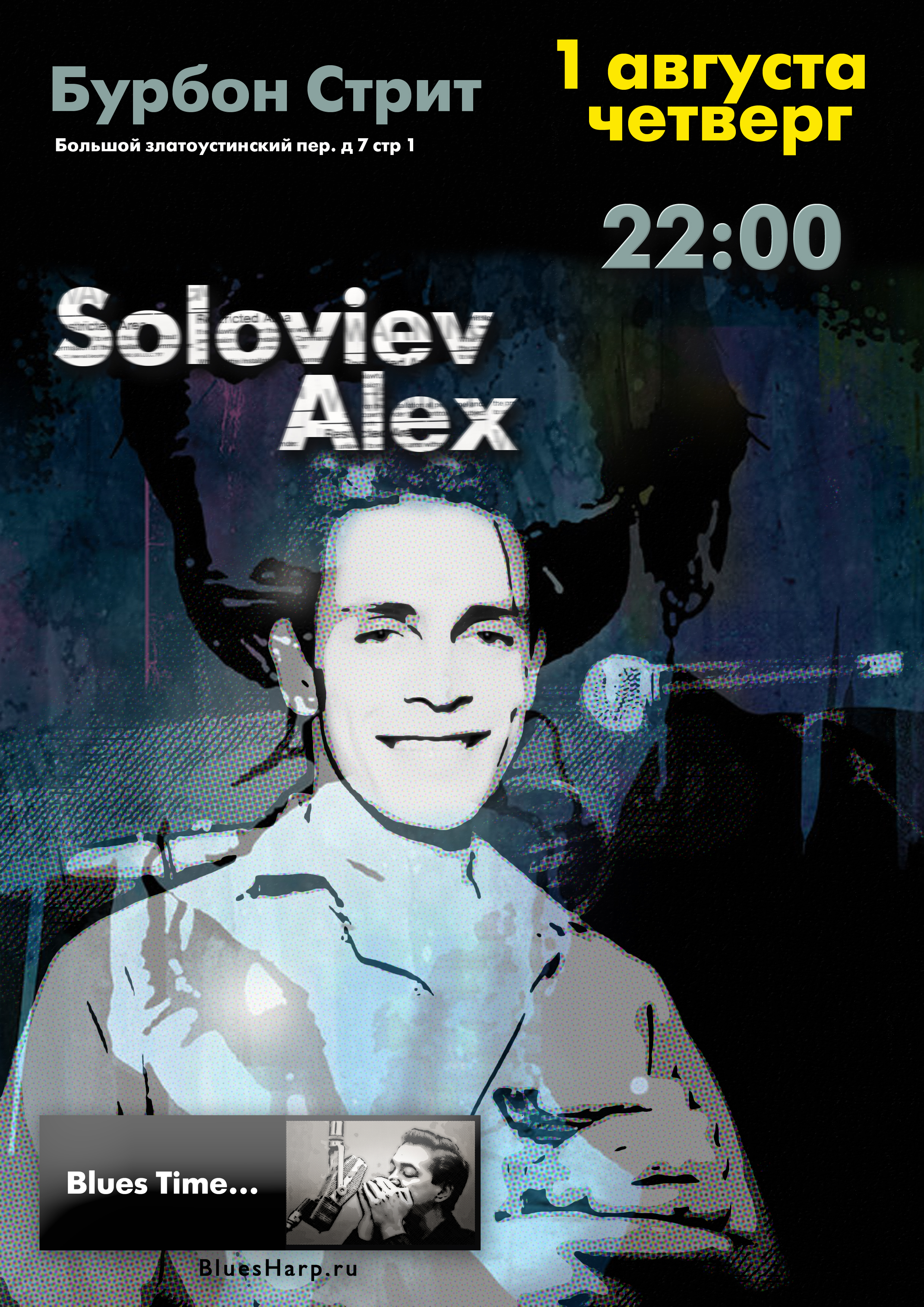 В этот четверг (01.08.13) будет музыкальный вечер в Бурбон Стрит (Большой златоустинский пер. 7. стр. 1). Начало в 22:00. Соловьев Алекс будет играть много авторской музыки. И будет очень много губной гармоники, как акустической, так и электрической. Добро Пожаловать!