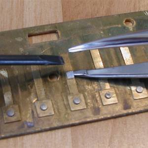 | На саммите гармонистов в Минеаполисе в 2000г., Turbo Dog (он же Доктор Джеймс Антаки во время дискуссии по физике язычка и рта, выделил проблему писка язычков, как отдельную тему. Он сказал, что такие гармоники как Lee Oskar страдают от осевых колебаний язычка, находящегося под физическим напряжением, и что, согласно его первоначальным тестам, эти колебания можно загасить приклеиванием маленького квадратика ленты на середину язычка с «подветренной» стороны. Теоретическая база этого способа решения проблемы имеет аэродинамическую природу. Многие видели съемки раскачивающегося моста Tacoma Narrow под воздействием сильного ветра, когда он изгибался как резиновая лента. Турболента работает аналогично тому, что дизайнеры мостов разработали для предотвращения этой ситуации. Данный метод состоит в простом приклеивании квадратика клейкой ленты на середину язычка. Форма очень важна – квадрат или нечто приближенное к квадрату, похоже, показала себя с наилучшей стороны. Размер не играет роли. Фактически лента должна быть достаточно маленькой, чтобы не перекрывать края язычка и не прикасалась к пластине. Таким образом, сторона квадрата должна быть слегка уже, чем ширина язычка. Слишком малые размеры ленты снижают желаемый эффект, равно как и слишком большие размеры ленты, скажем прямоугольной формы, хотя иногда это неизбежно, когда вы пытаетесь вырезать крохотные квадратики. Подойдет любая клейкая лента, которую можно разрезать на нужные размеры. Моя любимая лента это 1,5 мм лента для графики, которую легче всего резать на 1,5 мм квадратики. Если вы пользуетесь лентой этой ширины, то все что вам требуется для изготовления Турболенты – это сделать один отрез. Я приклеиваю несколько сантиметров ленты на пустую пластиковую бутылку и по мере надобности отрезаю от нее квадратики. Графическую ленту не так то просто разрезать, потому что она сделана из мягкого винила и клей лежит довольно толстым слоем, но его можно разрезать, если резать в одном направлении. Клей позволяет переклеить квадратик если надо, и тем не менее держит его. Старайтесь делать ровные края, так чтобы никакие заусеницы не закусывались между язычком и пластиной. Аэродинамическая теория Turbo Dog’а гласит, что лента должна располагаться на «подветренной» или конвекционной стороне ближайшей к пластине. Это немного усложняет установку на вдоховой пластине и в случае, если вы забыли о ленте при изменении зазора вдохового язычка, вы можете сместить ленту и таким образом усложнить себе жизнь. К счастью, установка ленты «снаружи» вдохового язычка похоже тоже работает хорошо для подавления визга язычка, и поэтому вам не обязательно полностью разбирать гармошку. Используйте обычное лезвие для отрезания и размещения ленты на язычке, а с помощью зубочистки можно приклеить ленту к язычку. Инструмент из набора Lee Oskar для установки зазора очень удобен для разглаживания ленты наружной стороной крючка, но вы можете использовать любой удобный вам инструмент. Турболента была успешно опробована на Lee Oskar, Huang Star Performer и Silvertone Deluxe, Suzuki ProMaster и BluesMaster, Bushman, и на язычках серии Hohner MS. Она даже помогла стабилизировать язычки HM серии Hohner и Hering Blues. Мы клеили ленту на оба язычка на каждом отверстии на азиатских гармониках, что можно было делать без разборки пластин. Это также можно сделать и с Hohner HM и c Hering Blues, но мы 
