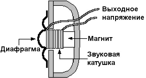 В динамических микрофонах звук преобразуется в электричество, заставляя колебаться диафрагму (мембрану), с которой жёстко связана катушка индуктивности (звуковая катушка). Движение катушки в поле постоянного магнита порождает на концах обмотки электричество, по напряжению пропорциональное амплитуде звуковой волны.