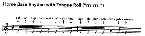Как вы вероятно заметили, игра здесь идет намного больше на вдохе, чем на выдохе. И иногда вы настолько переполняетесь воздухом, что вам просто необходимо как нибудь избавиться хотя бы от части его. И один из способов избавиться от воздуха, это делать трель языком и выдыхать, вот так: