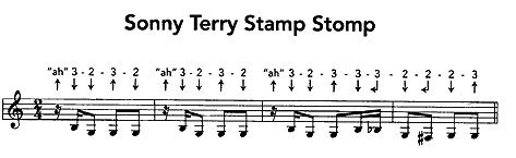 Один из самых удивительных харперов, которых я когда либо слышал, был Сони Терри. Он был причиной, по которой я начал играть на гармонике, причиной номер один. Когда я услышал его, я понял, что просто должен научится играть также как он. Он был замечательный ритм-исполнитель. Он добавлял уханье, вокальные звуки в свою игру на гармонике. Вот так: