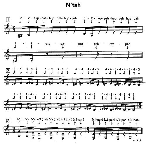 Давайте сыграем тот же ритм, но на выходохе перейдем на другие дырки, вместо того чтобы выдыхать через 1, 2, 3, вы выдыхаете через 2, 3, 4, но вдыхаете все равно через 1, 2, 3: