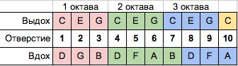 Для блюзовой 10-ти дырочной мажорной диатонической гармошки стандартным является "строй Рихтера". Для гармошки в тональности С (До) он будет такой: