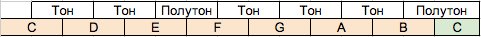 Мы знаем, что между нотами есть расстояния, которые измеряются в тонах и полутонах (1 тон = 2 полутона). Ниже приведена таблица этих расстояний для наших мажорных нот:
